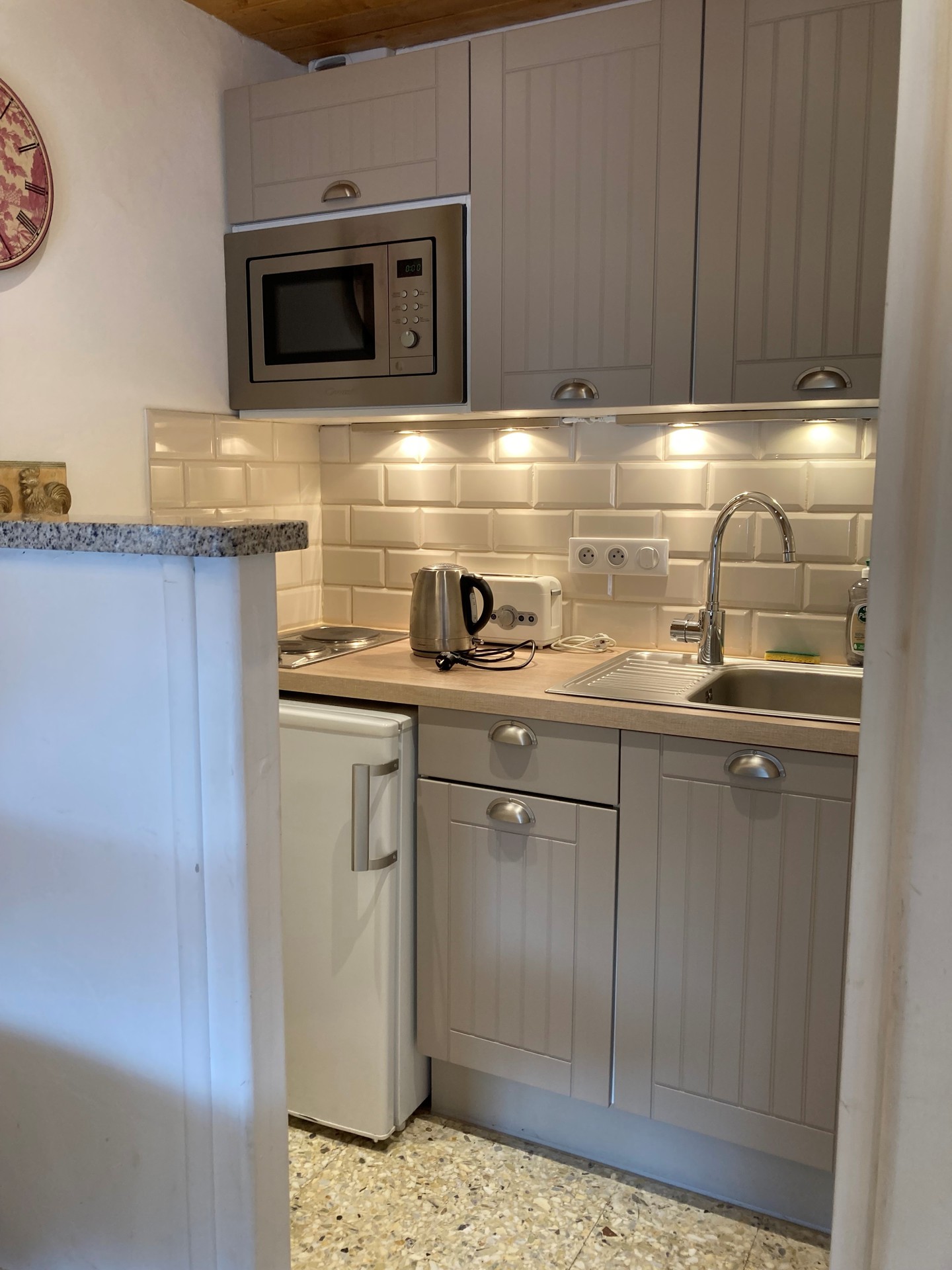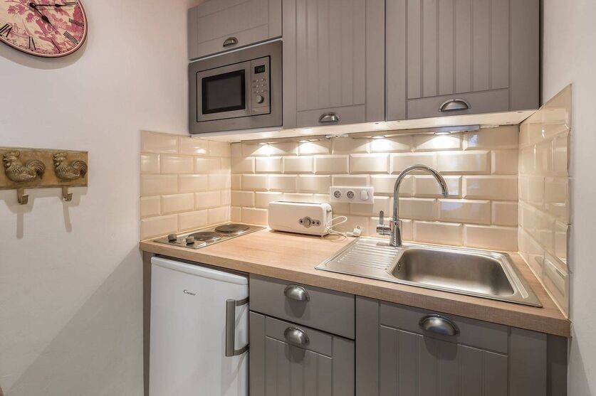 Studio of approximately 19 sq-m for 2 people + 1 children maximum on the 5th floor of a residence with elevator.Kitchen area equipped with electric hobs (2 burners), microwave grill, Italian coffee maker with plunger and electric filter coffee maker, toaster, kettle and refrigerator.