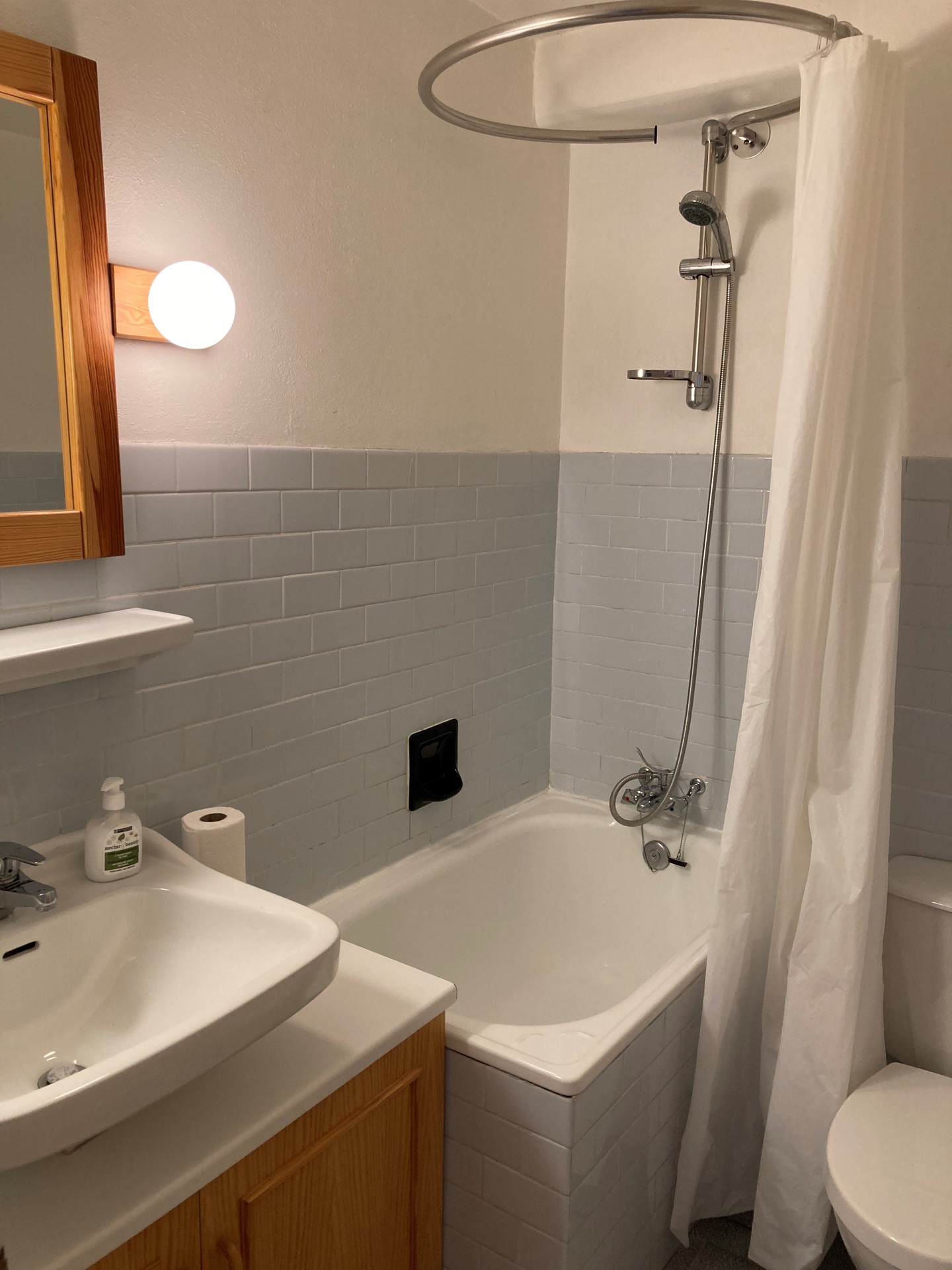 Bathroom with small bathtub/shower and toilet.